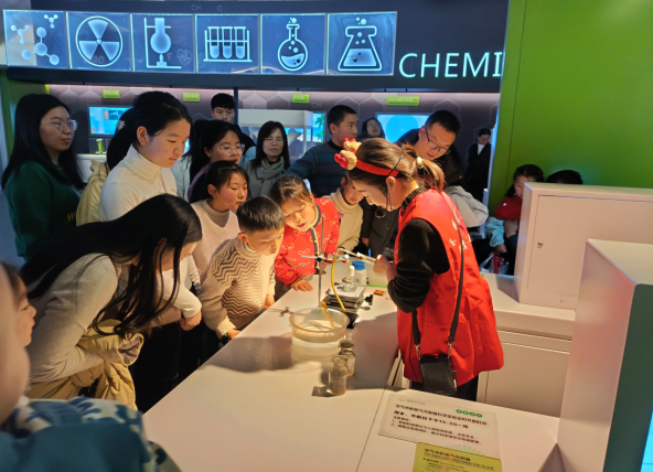 展厅每日定时开展“皂化反应”“氧气的制备”等经典实验,通过动手制作肥皂、观察氧气助燃现象,学习化学反应原理及日常应用,培养科学探究能力。从实验台到生活,科学就在你我身边!